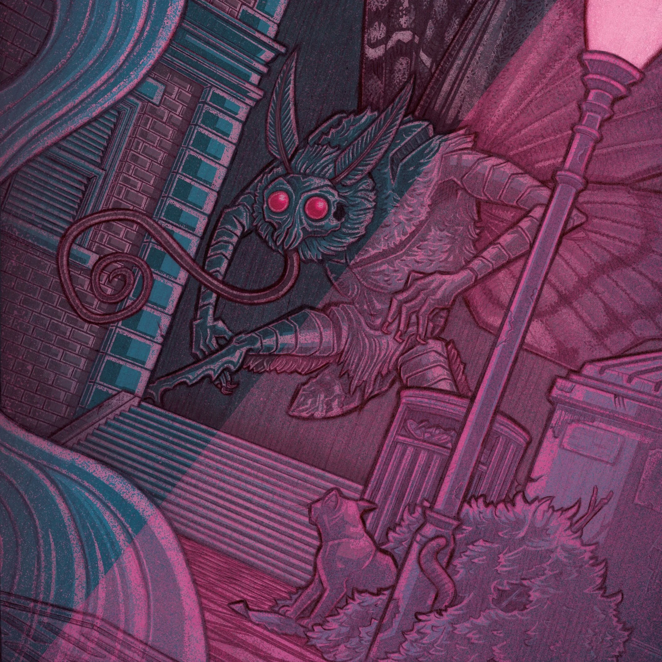 An illustration of a cryptid known as the Mothman. This entity was mainly seen between November 1966 and December 1967 in the area surrounding Point Pleasant, West Virginia.