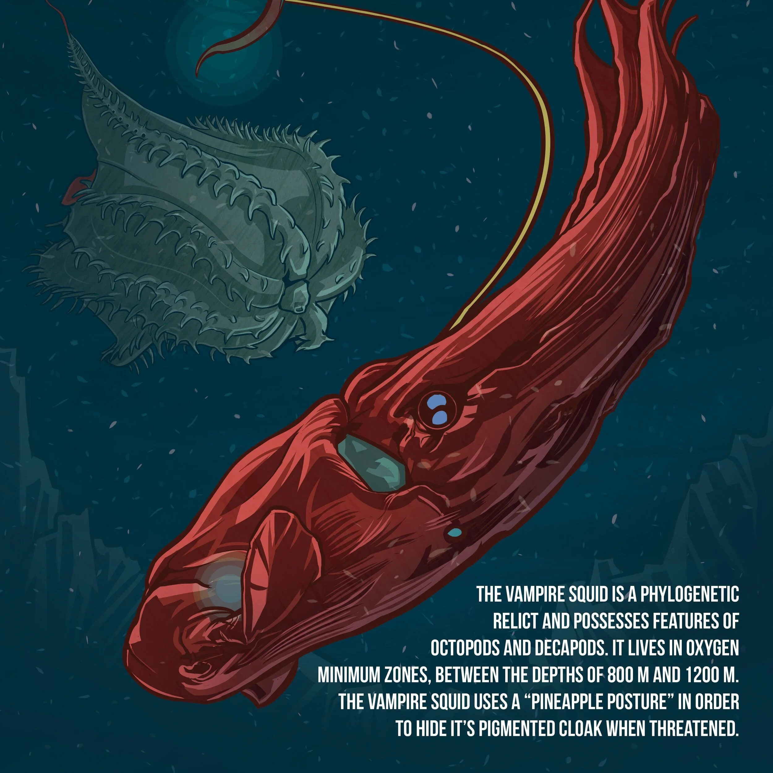 An info illustration about the Vampire squid. Their latin names translates to "the Vampire Squid from Hell". Photoshop. 11.5" x 22".