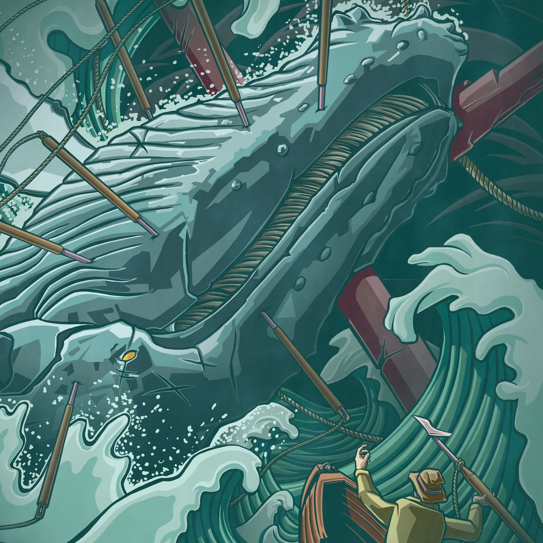Illustration depicting the struggle between a humpback whale and a whaler. Inspired by Mastodon's album "Leviathan", and Gojira's album "From Mars to Sirius".